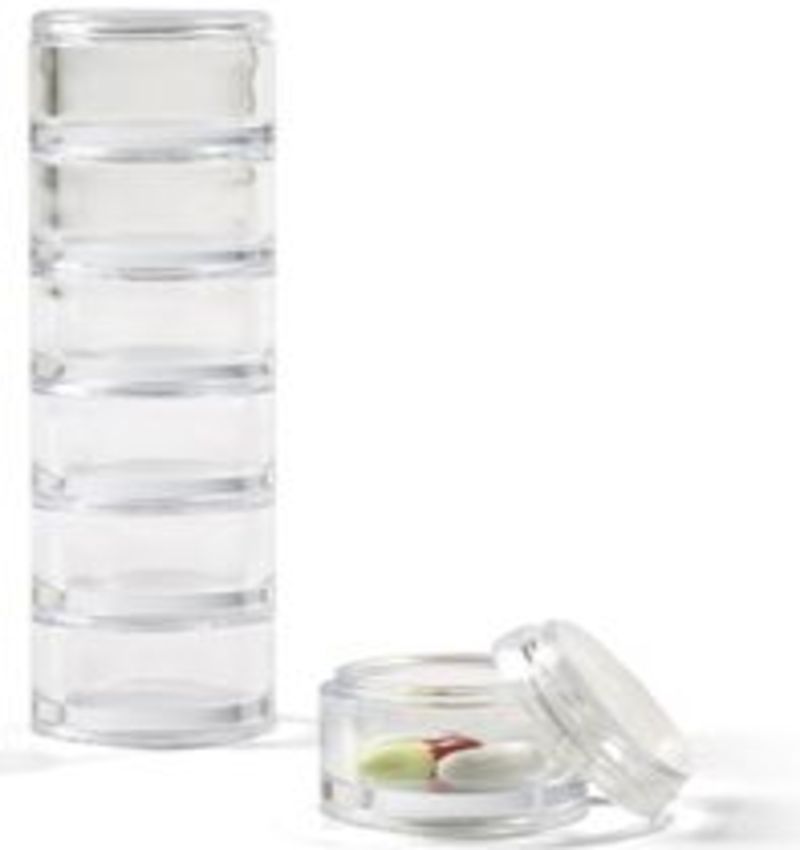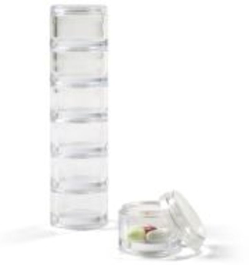 I just traveled recently and really did not want to check bags, so wanting to comply with the "3-1-1" airline regulation of putting your liquids and gels in a quart-size plastic zip-top bag, I looked around for creative solutions. I had this 7-section stacking pill container that I got from Container Store, and I decided it was the perfect thing to try for my various "potions" to save room. I just put a few pumps of my skin care items, makeup, and hair gel into each compartment, and it worked GREAT! Each compartment serves as the lid for the next one as they screw together into a tower of toiletries only about 6" high.